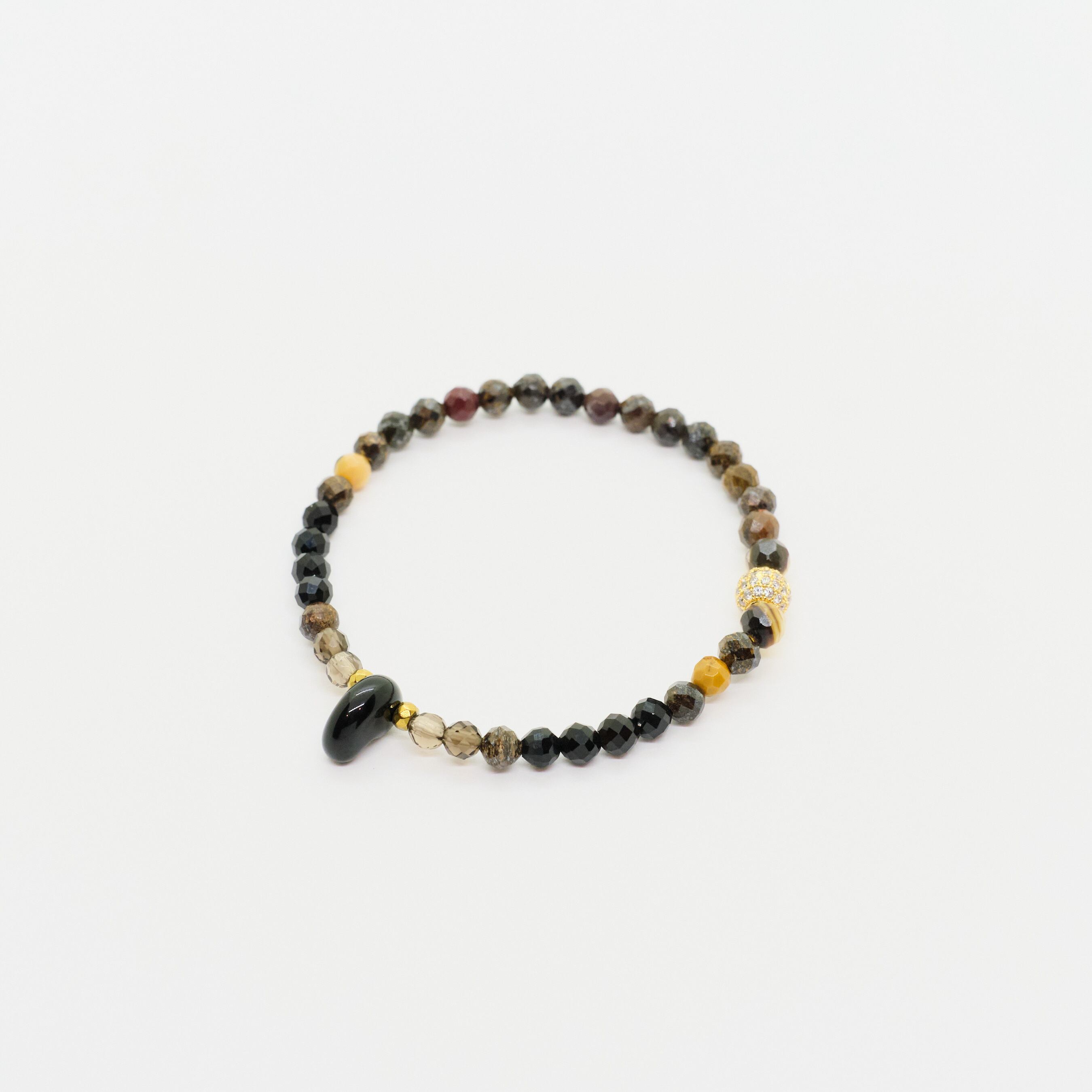 厳選したブロンザイトにジャスパーを散りばめて、ポイントの勾玉にはオニキスを使用した時代に左右されないシンプルデザインブレスレットです。